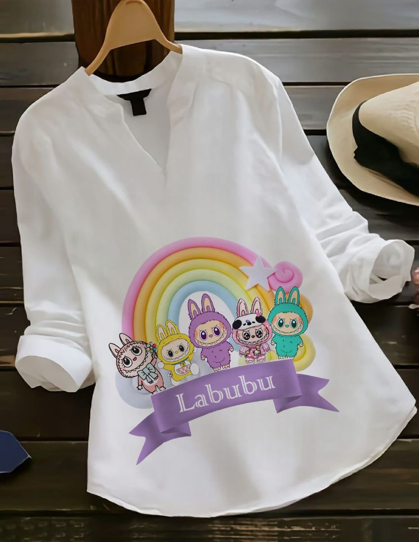 Add a playful touch to your outfit with this Labubu Cartoon Character Rayon Top for Women. Featuring a colorful rainbow and the beloved Labubu bunny friends in pastel hues, this white long-sleeve blouse is perfect for casual wear, anime conventions, or simply expressing your fun, whimsical side.