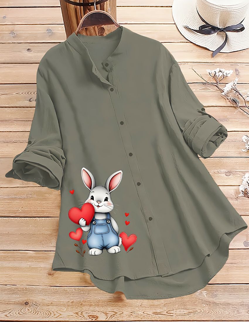 This stylish and comfortable button-up shirt. adding a playful and charming touch. With a relaxed fit, rolled-up sleeves, and a mandarin collar, this shirt is perfect for casual outings or lounging in style. making it a great choice for any season. Pair it with jeans or leggings for a cute and cozy look!