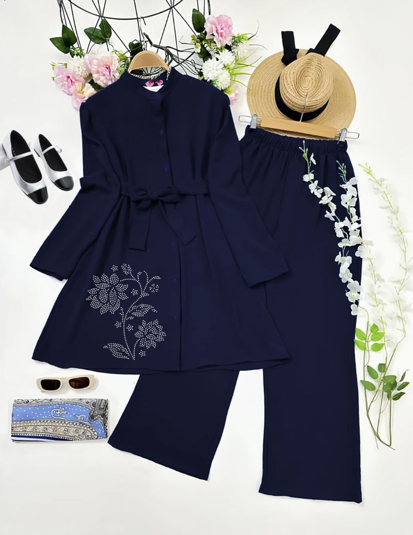 Step into effortless elegance with this blue-colored co-ord set, flowy top adorned with diamond work floral embellishments. The top includes a belt tie at the waist for a flattering silhouette and pairs perfectly with matching wide-leg trousers. This outfit is perfect for festive gatherings, casual outings, or semi-formal events.