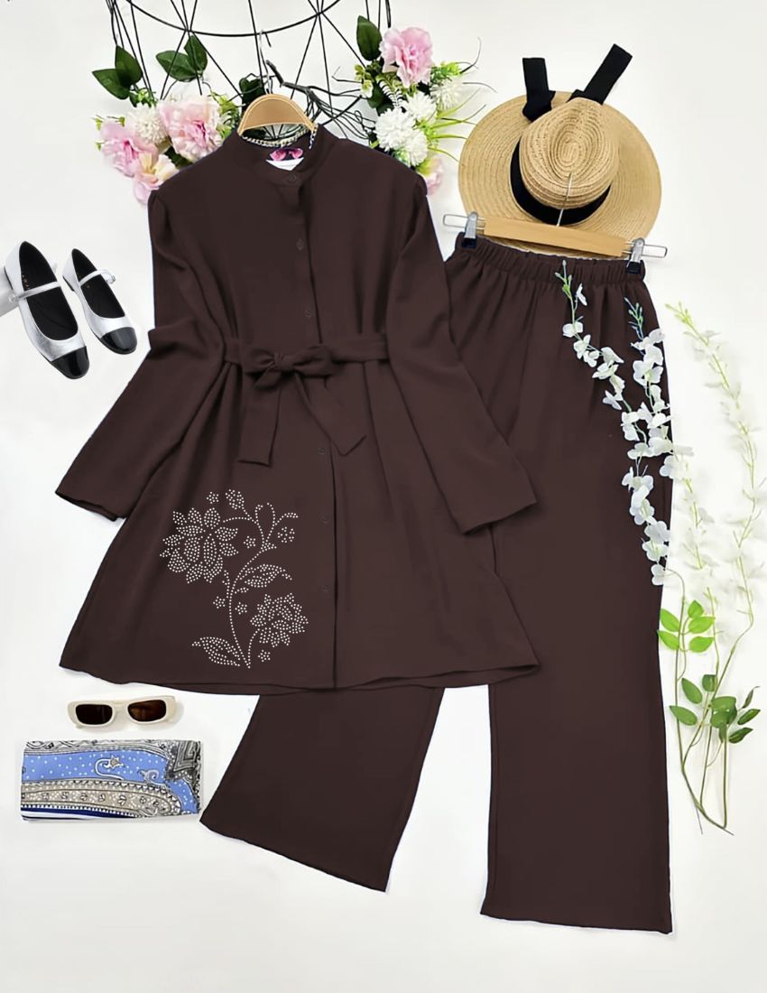 Step into effortless elegance with this brown-colored co-ord set, flowy top adorned with diamond work floral embellishments. The top includes a belt tie at the waist for a flattering silhouette and pairs perfectly with matching wide-leg trousers. This outfit is perfect for festive gatherings, casual outings, or semi-formal events.
