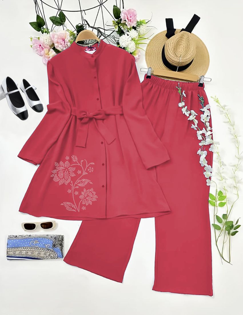 Step into effortless elegance with this pink-colored co-ord set, flowy top adorned with diamond work floral embellishments. The top includes a belt tie at the waist for a flattering silhouette and pairs perfectly with matching wide-leg trousers. This outfit is perfect for festive gatherings, casual outings, or semi-formal events.