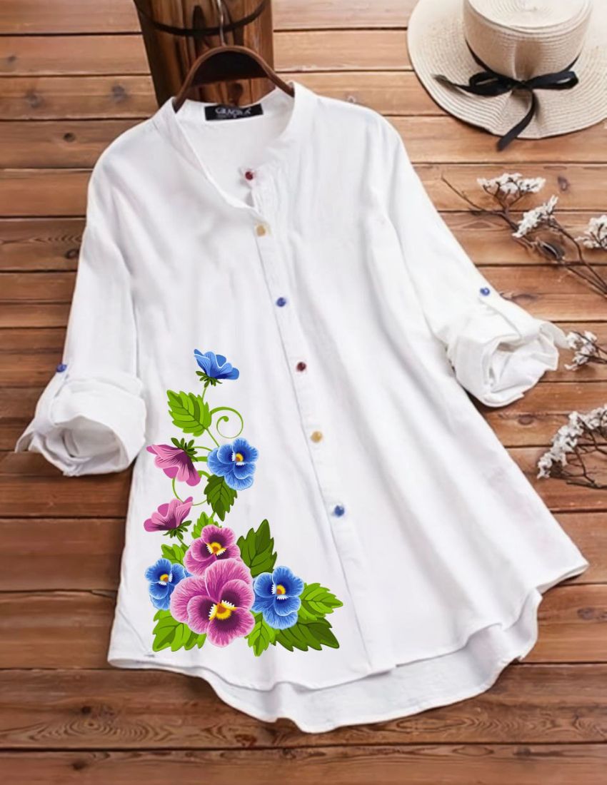 This top is a casual, elegant Top made from light and breathable rayon fabric, ideal for everyday wear or occasions. The floral print adds a feminine and artistic flair. he buttons are multicolored, adding a subtle playful touch to the shirt. The relaxed fit ensures comfort and versatility, suitable for pairing with jeans, trousers, or skirts.