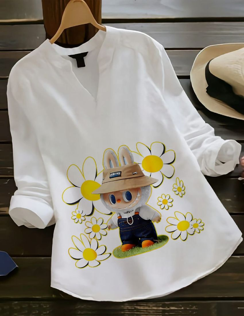 Add a touch of whimsy to your everyday wardrobe with this adorable white rayon V-neck top for women, featuring the beloved Labubu doll in a playful garden scene surrounded by cheerful daisies.
