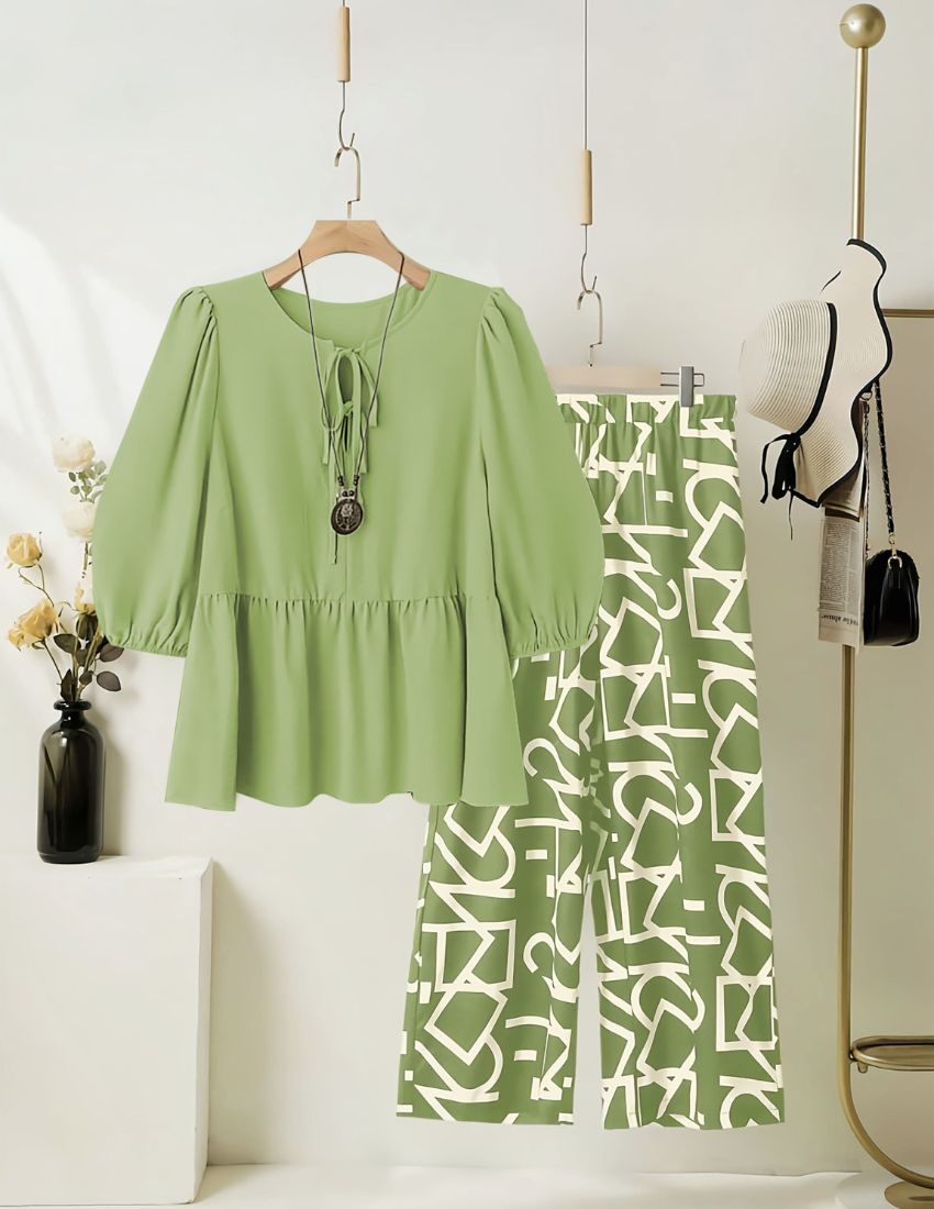 Elevate your everyday look with this refreshing green top bottom set that brings together ease and elegance. The solid peplum top features soft gathers, full sleeves, and a dainty tie-up neckline — striking the perfect balance between relaxed and refined. adding a pop of personality to your outfit.
