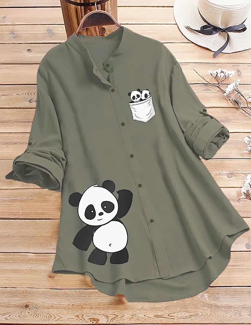 This stylish and comfortable button-up shirt. adding a playful and charming touch. With a relaxed fit, rolled-up sleeves, and a mandarin collar, this shirt is perfect for casual outings or lounging in style. making it a great choice for any season. Pair it with jeans or leggings for a cute and cozy look!
