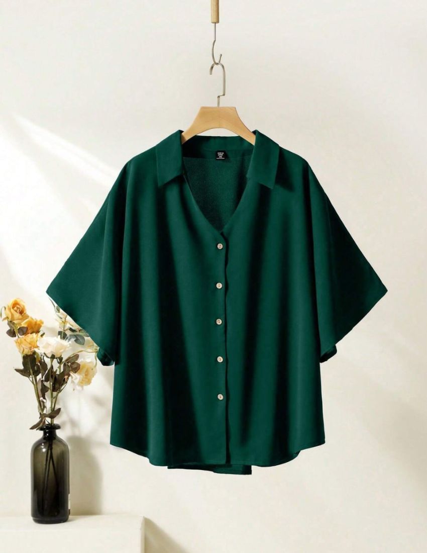 The design features a wide V-neck collar and short sleeves, giving it an airy and relaxed look. flowy sleeves and relaxed fit. The overall aesthetic is minimal and casual, suitable for everyday wear or a comfortable, laid-back outing.